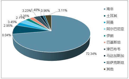鉻為鋼灰色金屬,鉻礦常被加工成鉻鐵,90%以上用于不銹鋼的生產。世界鉻鐵礦資源總量超過120億噸,據美國地質調查局的數據顯示,鉻鐵礦資源在全球分布極不均衡,主要分布在南非、哈薩克斯坦、津巴布韋、芬蘭、印度、巴西等國,其中,南非、哈薩克斯坦和津巴布韋是世界上鉻鐵礦資源最豐富的3個國家。我國鉻礦資源很大程度以來進口,南非、土耳其和津巴布韋是我國鉻礦的主要進口國,分別占2017年我國鉻礦進口數量的72.34%,8.04%和3.23%。