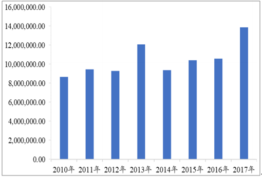 2017年,中國市場汽車產銷量分別為2994.20萬輛和2887.89萬輛,同比增長3.20%和3.04%,連續九年蟬聯全球第一。受購臵稅優惠幅度減小的影響,2017年乘用車產銷增速明顯減緩,是2008年以來年度最低增長水平。2017年,乘用車產銷分別完成2480.67萬輛和2471.83萬輛,同比分別增長1.58%和1.40%,均低于汽車總體約1.60個百分點,占汽車產銷比重分別約為85.50%和85.60%,分別約低于上年1.30和1.40個百分點。中國乘用車市場也進入了成熟期,增幅開始放緩。商用車產銷420.87萬輛和416.06萬輛,同比增長13.81%和13.95%。新能源汽車數據漲幅驚人,產銷量分別為79.40萬輛、77.70萬輛,同比增長53.8%、53.3%,產銷量同比增速分別提高了2.1和0.3個百分點。2017年新能源汽車市場占比2.7%,比上年提高了0.9個百分點,或成為未來汽車發展主流趨勢。