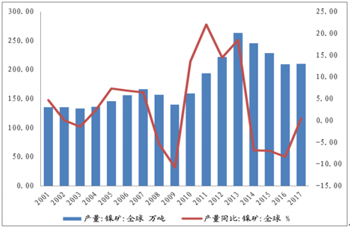 全球鎳礦儲量排名前三的國家分別為澳大利亞、巴西、俄羅斯,分別占全球鎳礦儲量25.68%、16.22%、10.27%,中國鎳礦儲量排名全球第八。產量上看,印度尼西亞鎳礦產量為最高,2017年達40萬噸,占全球鎳礦總產量19.05%。2017年我國鎳礦的表觀消費量達5252.83萬噸,僅10萬噸左右的鎳礦產量明顯不足以支撐我多對鎳礦的需求。因此,我國鎳礦主要來源于國外進口。截至2018年1月,印尼已批準鎳礦出口總配額2644萬噸,2018年第一季度累計進口鎳礦數量已達329.77萬噸。