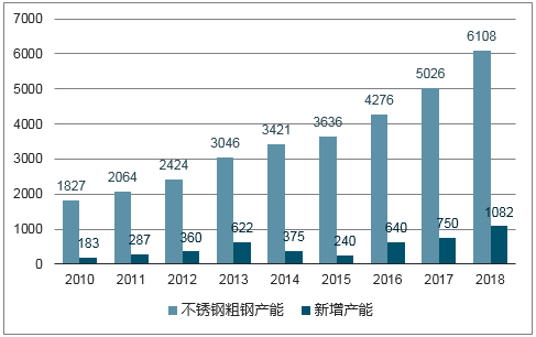 據我的不銹鋼網統計,2018年國內計劃新增不銹鋼粗鋼產能共計1082萬噸,其中,300系新增產能652萬噸,400系新增產能430萬噸。